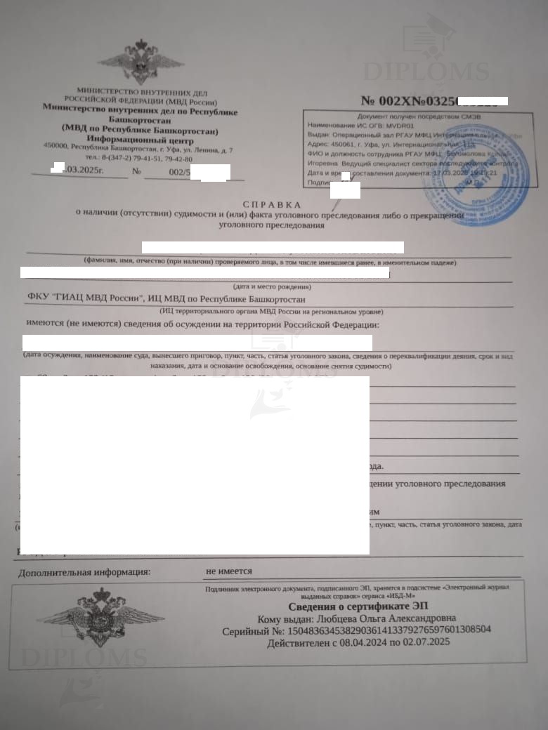 На что обратить внимание при покупке справки о несудимости? Очень многие организации делают справки только от определённых (популярных) регионов. Мы можем сделать справку о несудимости из любого региона/информационного центра. У нас есть образцы всех областей, республик, краев Российской Федерации. Эта база нарабатывалась годами. Также у нас самая большая база апостилей из всех регионов. Образцы справок о несудимости Из МВД (регионального информационного центра) Из МФЦ С портала Госуслуг С апостилем Апостиль нужен для предъявления документа за границами Российской Федерации. Мы делаем справки о несудимости от любых учреждений (МФЦ, МВД, с Госуслуг) и от любого региона Российской Федерации. От каких учреждений можно сделать справку о несудимости? Компания «Diploms» делает справки от МФЦ и от МВД. Также мы можем сделать электронный вариант, если вы заказываете справку в Интернете через портал Госуслуг. Это специальный PDF-файл, идентичный тому, что вы получаете через ГосУслуги. Что такое — чистая справка о несудимости? Чистая справка о несудимости — значит справка в которой стоят пометки — «НЕ ИМЕЮТСЯ, НЕ ИМЕЮТСЯ, НЕ ИМЕЕТСЯ». Это означает, что человек который получил данную справку не был судим никогда. Если вам нужна чистая справка — мы можем сделать это без дополнительных доплат. Как быстро купить справку о несудимости? Лучший способ быстро получить справку — заказать её на сайте Дипломс. Мы предлагаем сделать справку о несудимости без личного присутствия в самые сжатые сроки. От вас нужна только заявка в представленной форме заказа. Как только мы получим ее, мы свяжемся с вами в рабочее время, обсудим все детали и отдадим заказ в работу. |
